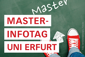 Zum Masterinfotag am 22. April 2017 präsentiert die Universität Erfurt ihre 20 Master-Programme. Studierende und Professoren stehen für alle Fragen rund ums Studium bereit und auch die Studienberatung ist vor Ort, um über Bewerbungs- und Prüfungsmodalitäten zu informieren. Mit einem Vortrag zur Studienfinanzierung sowie Campus- und Stadtführungen wird das Programm des Masterinfotags abgerundet.