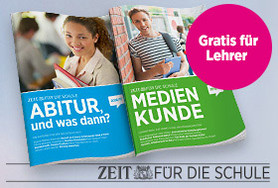 Mit »ZEIT für die Schule« unterstützt DIE ZEIT Lehrer und Referendare kostenlos mit aktuellen Unterrichtsmaterialien: »Medienkunde« und »Abitur, und was dann?« fördern die Medienkompetenz von Schülern und bieten eine Hilfestellung bei der Berufsorientierung. Darüber hinaus kann DIE ZEIT kostenlos 3 Wochen lang im Klassensatz bestellt werden.