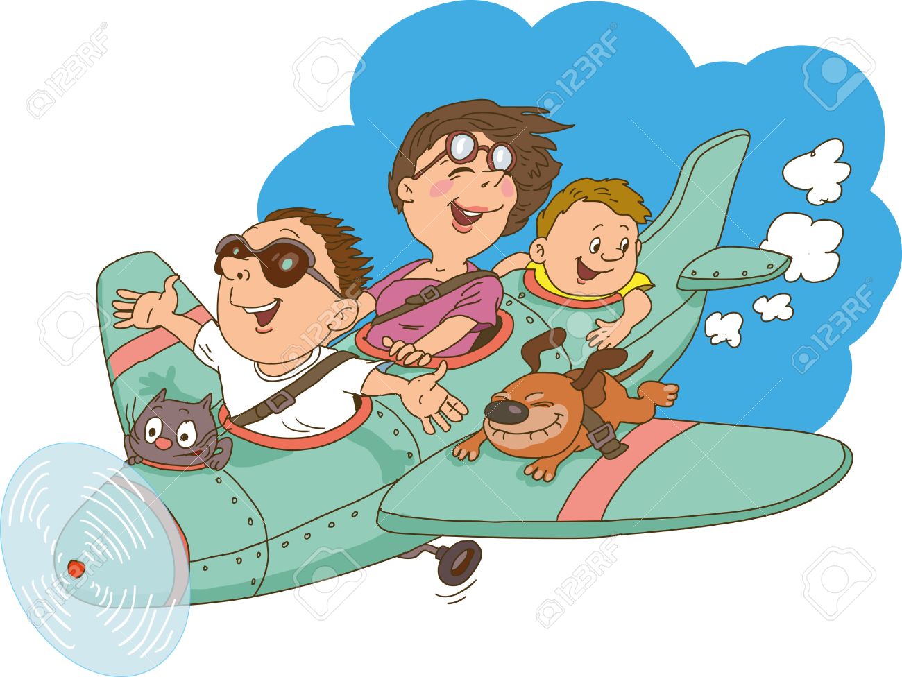 Familia De Dibujos Animados, Volando En Un Avión. Todo El Mundo Está Feliz Y Alegre. Ilustraciones Vectoriales, Clip Art Vectorizado Libre De Derechos. Image 59138601.